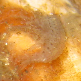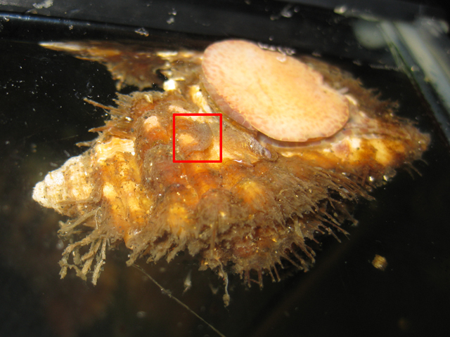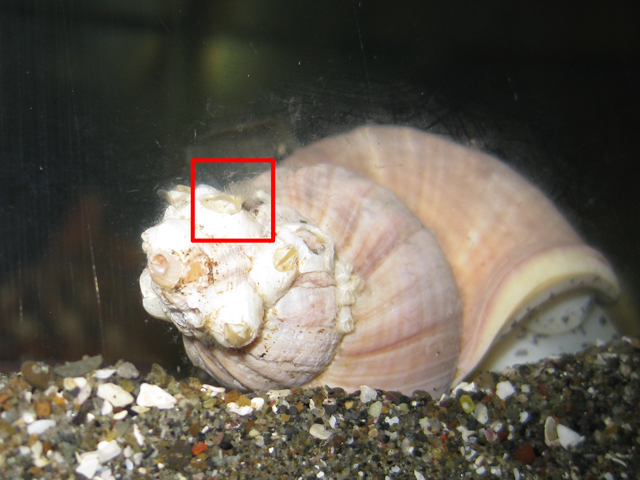 次(つぎ)は、フジツボである。ツブ貝(かい)の殻(から)に生息(せいそく)している。