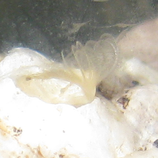 触手(しょくしゅ)を大(おお)きく広(ひろ)げたときの大(おお)きさが、直径(ちょっけい)約(やく)5ミリ程度(ていど)である。これも、エビ同様(どうよう)に大(おお)きく拡大(かくだい)しないと、なかなかわからない。
